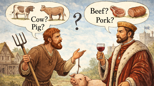 Это не случайность. И не странность. Это история завоевания, спрятанная в словах. В 1066 году Англию завоевали норманны. Они говорили по-французски. Как строилась их жизнь? И в языке это закрепилось навсегда. Слова для живых животных — англосаксонские: Это язык фермы, грязных рук и повседневной жизни. Слова для мяса пришли из французского: Это язык кухни, пиршеств и дворцов...