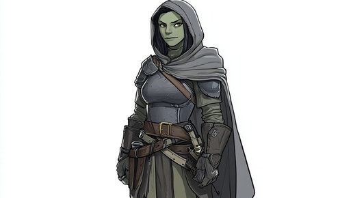 Создано на основе запроса: female teen orc ranger wearing a grey cloak and leather armor dungeons and dragons cartoon style V7