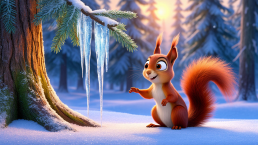 Жила-была в одном большом лесу маленькая белочка по имени Ляля. У неё был пушистый рыжий хвост, кисточки на ушках и очень любопытный носик. Ляля любила прыгать по веткам, собирать шишки и задавать сто тысяч вопросов в день. В то утро Ляля проснулась и выглянула из дупла. Лес было не узнать! Он весь искрился и переливался на солнце. А всё потому, что за ночь на ветках и крышах выросли удивительные ледяные украшения — длинные и прозрачные сосульки. — Ой, какая красота! — запищала Ляля и кубарем скатилась по стволу вниз...