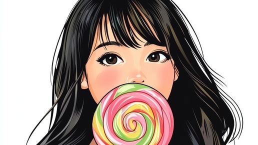 Создано на основе запроса: a good looking asian girl cartoon style enjoying a very big lollipop which has a big swirl on it