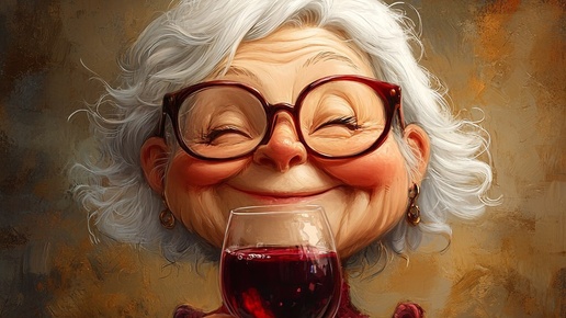 Создано на основе запроса: funny cartoon, illustrations, a mid-aged lady is happy because she is holding a huge glass of red wine --- Автоперевод: Забавный мультфильм, иллюстрации, женщина среднего возраста...