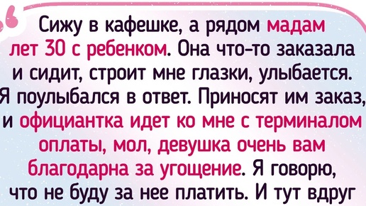 В кафе или ресторане можно не только вкусно поесть, но и разжиться крутой историей. Герои нашей статьи знают об этом не понаслышке, ведь они вышли из заведений общепита с впечатлениями, которыми просто нельзя не поделиться. Сижу в кафешке, а рядом мадам лет 30 с ребенком. Она что-то заказала и сидит, строит мне глазки, улыбается. Я поулыбался в ответ. Приносят им заказ, и официантка идет ко мне с терминалом оплаты, мол, девушка очень вам благодарна за угощение. Я говорю, что не буду за нее платить...