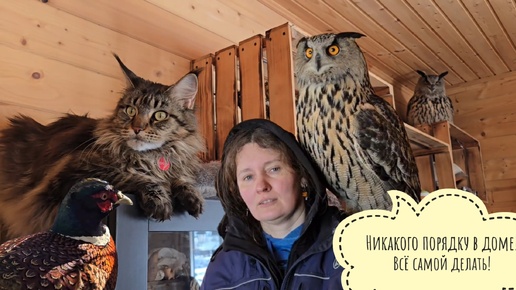 Сова филин Ёль хозяйничает в доме и выживает Артёма с кровати. Курочки обживаются в вольере