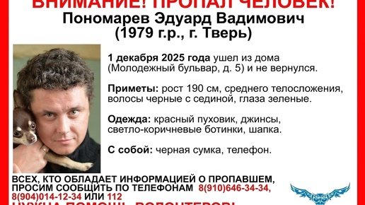 Волонтерский поисковый отряд “Сова” объявил о начале поисков жителя Твери Пономарева Эдуарда Вадимовича. Мужчина 1979 года рождения перестал выходить на связь 1 декабря после того, как ушел из дома №5 на Молодежном бульваре. Его рост составляет 190 сантиметров, телосложение среднее, волосы черные с сединой, глаза зеленые...