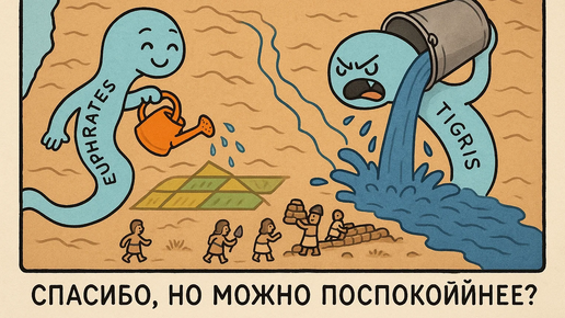 Двуречье (или Месопотамия) — это земля между двумя реками, Тигром и Евфратом. Почва здесь была супер-плодородной, как и в Египте. Но у этих рек был характер! В отличие от предсказуемого Нила, Тигр и Евфрат могли разлиться внезапно и бурно, снося всё на своем пути. Это было похоже на щедрых, но очень вспыльчивых родителей: сегодня они дарят тебе жизнь (воду и плодородный ил), а завтра могут в гневе разнести всю твою комнату (устроить наводнение). Поэтому первым "лайфхаком" местных жителей — шумеров — стало строительство насыпей и каналов...
