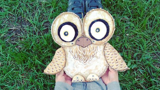 Я обожаю спилы деревьев. Это такой огромный простор для творчества. Натуральный материал, чистый, экологичный, а аромат свежего дерева - это, вообще, особый кайф. Всегда можно найти какую-то интересную деревяшку, корягу, ветку. А мы живем возле леса и этого добра - ну просто завались! )) Смотрите что получилось, имея под рукой всего один корявый пенек. Для такой совушки нужны - один спил покрупнее, три средних и четыре маленьких. К большому, с помощью саморезов, прикручиваем два средних кружка - это будут глаза...