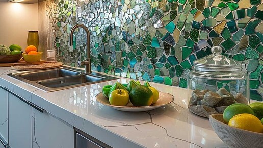 Мы собрали 13 идей для тех, кто хочет вдохнуть в кухню новую жизнь — с характером, глубиной и индивидуальностью. От природного камня до мозаики ручной работы, от зеркал до розовой плитки… Выберите ту, что расскажет вашу историю. Изысканный и эффектный выбор для тех, кто любит драгоценную глубину. Каменные прожилки в керамограните смотрятся как срез самоцвета — особенно выразительно в подсветке. Глянцевая поверхность и смелый принт — от ботанических рисунков до абстракции. Хорошо отражает свет и визуально расширяет пространство...