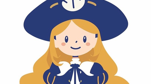 Создано на основе запроса: a cartoon female character standing naturally, wearing a navy blue and white musketeer uniform with a large feathered hat, shoulder-length soft blonde hair, with a warm and gentle smile, same character and style as the reference image, flat 2D vector illustration, Japanese kawaii design, minimal and clean --- Автоперевод: Мультфильм-женский персонаж, стоящий...