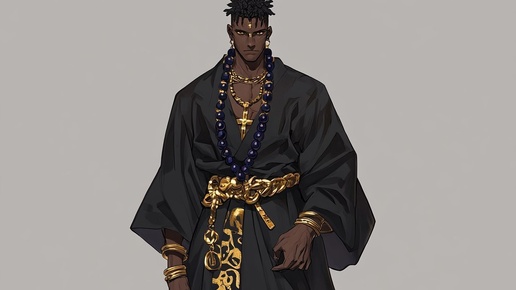 Создано на основе запроса: Charon from Fire Force, tall, muscular, handsome, wearing African style robes, black and gold, braided hair with golden tips, black sandals, large royal blue monk beads, niji 6 --- Автоперевод: Харон из огненных сил, высокие, мускулистые, красивые,...
