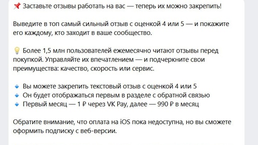 Какая же гадкая компания VK. Мало того, что они внедрили отзывы в функционал только около года назад, не дав возможности перенести старые отзывы, которые в виде обсуждения сотнями накопились за много лет существования группы, так они их ещё и монетизировали...