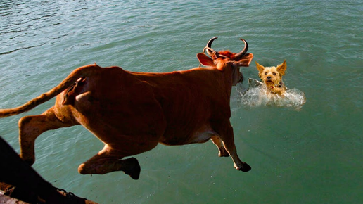 Корова, увидев, что дед бросил собаку в воду, не смогла остаться в стороне и нырнула прямо туда
