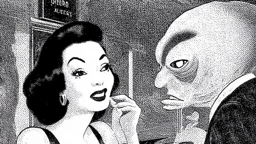 Создано на основе запроса: halftone cartoon print of a a pretty girl on a date with a frumpy grumpy fat old alien from nibiru, they are