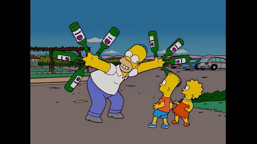 Гомер Симпсон, пожалуй, самый яркий персонаж сериала Симпсоны. Он веселый, динамичный, смешной и запоминающийся. Отчасти он именно такой благодаря одной своей пагубной привычке – Гомер любит выпить. Хоть на предыдущей картинке вы и видите бутылки из-под вина, настоящая страсть Гомера – пиво. Кстати, говоря о лишнем весе Гомера¹, можно предположить, что пиво тоже повлияло (не задумывалась об этом раньше, только на обжорство скидывала). В детстве я не обращала внимание на то, как часто нам показывают пьющего Гомера...