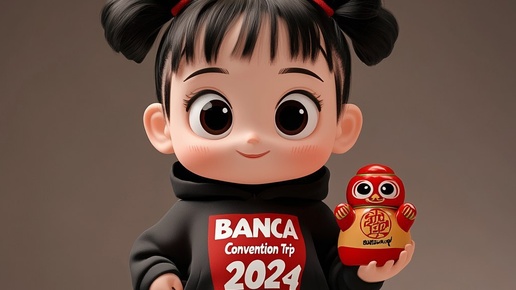 Создано на основе запроса: 3D modelling, clean background, face front , stand straight, little girl, cartoon style, round face, big head , black hair with red highlights, full body , shoes , wearing black hoodie with DBS red logo, red T-shirt with "BANCA Convention Trip 2024" text, holding red daruma doll, vibrant colour --- Автоперевод: 3D-моделирование, чистый фон, спереди лица, стоять...