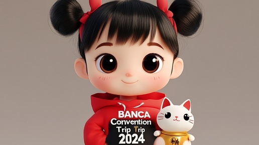 Создано на основе запроса: 3D modelling, clean background, face front , stand straight, little girl, cartoon style, round face, big head , black hair with red highlights, full body , shoes , wearing red hoodie with DBS logo, black T-shirt with "BANCA Convention Trip 2024" text, holding a japanese style lucky cat, vibrant colour --- Автоперевод: 3D-моделирование, чистый фон, спереди лица,...