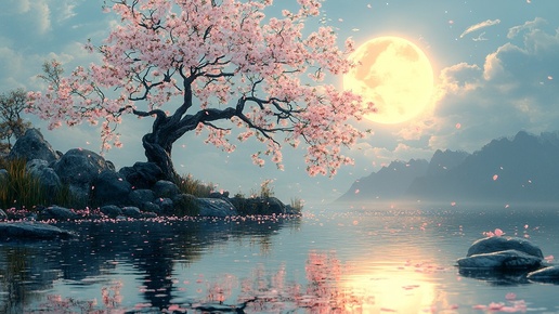 Создано на основе запроса: elegant digital painting of a majestic cherry blossom tree in full bloom at the centre of a calm reflective lake, under a softly glowing full moon, gentle pink and white petals on gracefully twisted branches, twilight blue sky scattered with subtle stars, moonlight casting soft shadows across smooth stones and water, traditional Japanese-inspired setting with peaceful minimalist composition, delicate pastel tones, softened colors, subtle mist in the distance for a dreamy...