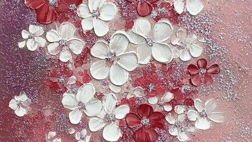 Создано на основе запроса: A painting of delicate cherry blossoms in shades of pink and red, scattered across the canvas with white flowers that resemble stars against the soft background. The petals have intricate details and textures, giving them an elegant appearance. They appear to be floating or gently falling down from above, creating a sense of movement on the textured surface below...
