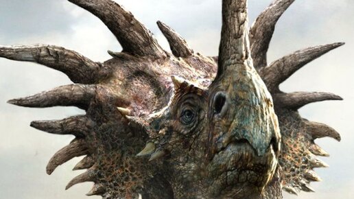 Динозавр этот мощный, весь в рогах на голове. На носу есть рог огромный, воротник в рогах везде. Он похож на носорога, мощный, грозный и большой. Но в стада сбивался только, вместо губ был клюв крутой. Хищников он не боялся, в стаде множество самцов. На защиту стада встанут, сотни выставив рогов! 75 млн. лет назад. На опушке позднемелового североамериканского леса стоит фырканье и гул. Шум насторожил группу утконосых динозавров, Ламбеозавров, что обгладывали листья неподалёку. Они прекратили жевать и пристально всматривались в сторону гула...