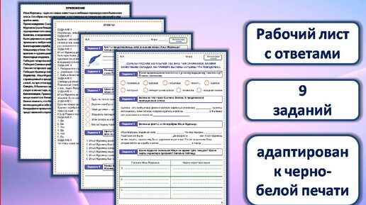 Рабочий лист разработан к уроку литературного чтения в 4 классе. Состоит из 9 заданий (на двух листах). Имеются ответы к заданиям (на одном листе). Также имеется приложение с фактами из биографии Ильи Муромца, которых нет в учебнике. Задание 1. Какие произведения относятся к устному народному творчеству? Отметь галочками. Задание 2. Вспомни, что такое былина. Вставь в предложения пропущенные слова. Задание 3. Вспомни факты из биографии Ильи Муромца. Задание 4. Какие подвиги совершил Илья во время трёх поездок? Какие черты характера проявил? Заполни таблицу...