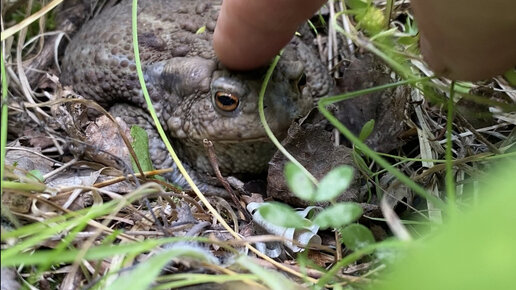 Встреча в лесу с жабьим королём. Совсем не вдупляю про половую и видовую принадлежность данного красавчика (красавицы?😃), но такую громадную жабу повстречала впервые. Для сравнения - обратить внимание на мой совсем не маленький палец, гладящий данную особь по макушке...