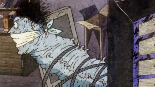 Потец - далеко не единственный плохой мультик. Сегодня мы разберём ещё один плохой мультик - Его жена курица. Название уже странное, интересно, о чём мультик? По сюжету, в квартире живёт "обычная" семья - синий муж, жена курица и питомец - большая голубая гусеница с человеческой головой. Ду уж, о чём думали создатели мультфильма. Но допустим. В семье всё хорошо. Хотя как хорошо - курица делает всё по дому, а муж сидит в кресле и запускает автобус по грамм-пластинке. Неожиданно в квартиру приходит гость - серый человек в маске...
