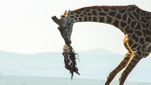 О некоторых животных мы знаем с детства. Взять, например, жирафа. Факты о том, что он живёт в Африке и является самым высоким млекопитающим на планете нам вдалбливали с пелёнок. Но ясельки закончилось, пора переходить к брутальным фактам! О том, что жирафы едят мертвечину, в их подмышках спят птицы, а их детёныши падают с высоты 2 метров точно не расскажут в энциклопедии. Меланхоличные создания никак не тянут на брутальных хищников. Но в тихом омуте черти водятся. По крайне мере, первое время именно чертовщиной объяснялись кадры, на которых жирафы поедали и подбрасывали тушу антилопы гну...