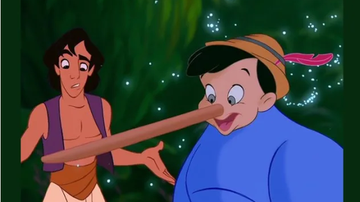 Как понять, что Аладдин врет? 1 Он по-идиотски хихикает 2 Джинни начинает корчить стыдливые рожи 3 Перо на его тюрбане падает