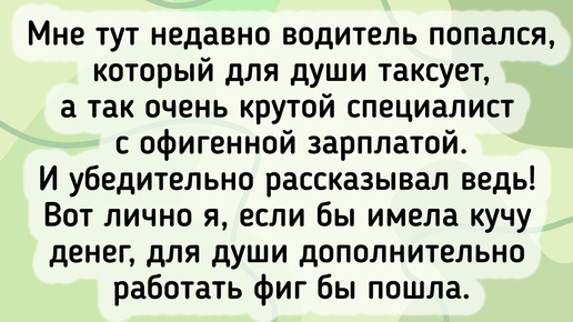 Даже те, кто нечасто пользуется услугами такси, имеют в запасе хотя бы одну незабываемую историю о совместных поездках. А уж у таксистов так их просто не перечесть и почти каждая — сюжет для кинофильма. Оно и не мудрено: коротая время за разговором, иной раз можно очень многое узнать друг о друге даже за 15 минут поездки. У меня дико заболел бок, я была на работе. Согнутая, в слезах вызываю такси. Села на заднее сиденье, говорю адрес. Водитель — дядечка в годах — спросил, что со мной. Говорю, что болит живот, нужно лечь и пройдет...