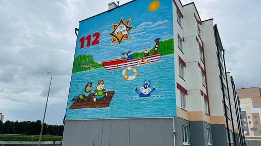 💪На жилом доме в Калинковичах появилось граффити МЧС На торце дома изображены яркие и символичные образы: спасательный круг, купающиеся герои мультфильма «Спецотряд 112, а также номер службы спасения «112»...