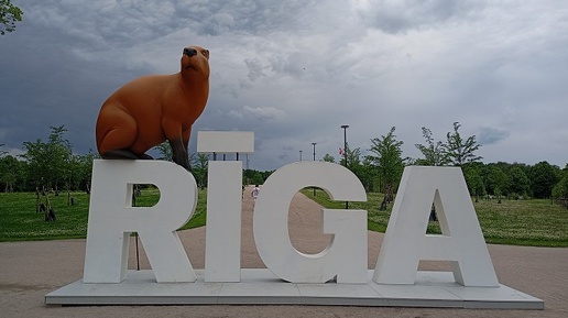 В феврале в столице Латвии, около памятника Свободы, появился кот – серо-чёрный Страуме из латвийского анимационного фильма «Поток», получившего в этом году первый в истории страны «Оскар». На огромной надписи «Рига» он успел посидеть ещё и на Ратушной площади, откуда в мае был перенесён к часикам «Laima», предоставив место напротив Рижской думы – второму своему соратнику по спасению от разрушительного наводнения – Псу. На третьего героя «Потока» - капибару – я пошла смотреть в начале июня в парк Победы...
