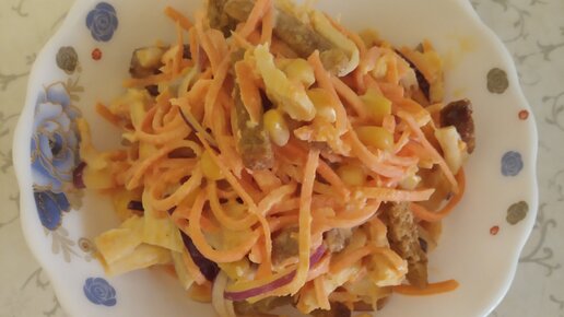 Салат "Карусель". Ингредиенты: 200-250гр. корейской моркови. 150-200гр. копченой куриной грудки. 1 маленькая баночка консервированной кукурузы. 1 средняя луковица. 1 пакетик сухариков. Соль и перец по вкусу. Майонез для заправки. Приготовление: Копчёную куриную грудку режем полосками или разбираем на волокна и выкладываем в салатницу...