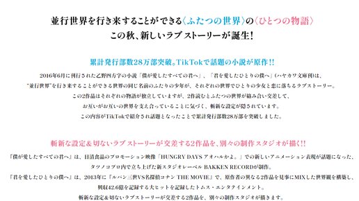 Премьера обоих полнометражных аниме состоится 7 октября. За сценарий отвечает Рико Сакагути (Kaguya-hime no Monogatari). Режиссером картины Boku ga Aishita Subete no Kimi e от студии BAKKEN RECORD выступает Ацуси Мацумото (Persona: Trinity Soul), а Kimi wo Aishita Hitori no Boku e от студии TMS Entertainment — Кэнъити Касай (Bakuman)...
