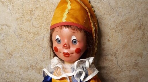 Грустная кукла "клоун" из советского детства: подборка №1 с двухцветным костюмом. Фабрика игрушек им.8 марта
