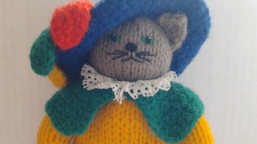 Всем добрый день!Сейчас просматривала фотографии своих работ и нашла на мой взгляд интересную работу,вязала всё наугад,никаких подсчётов и записей не производила,а зря.Вязала основу спицами,остальное крючком.На заказ хорошим людям.За всё время связала только два кота в сапогах.Процесс работы-Сначала вязала заготовку,прошивала на машинке,шов сзади,набивала синтепоном.А потом оформляла на мой вкус и взгляд.В самом конце работы,когда кукла приобрела нужный вид,начинается для меня трудоёмкая работа-вышивка...