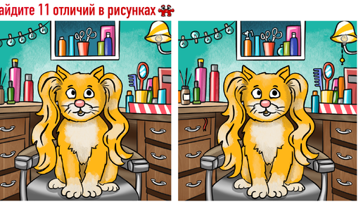 11 отличий в парикмахерской. Интересные задачки с рыжим котиком - отвлекаемся от забот с пользой для ума.