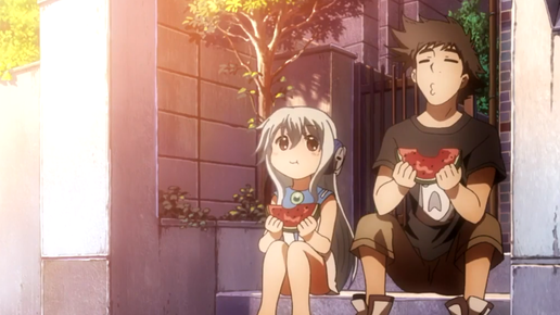 "Если такой андроид, как я загадает желание, - Бог исполнит его?" 9 августа. Солнце палит, цикады поют. Цитируется дневниковая запись про желание автора оказаться на море с Кеиширо. Полусломанная музыкальная шкатулка Режиссёр Кавагути Кэйитиро А когда-то... Парень забежал в синтоистское святилище укрыться от ливня, а там в кресле синеволосая девочка-андроид сидит с подсолнухом. Он её утащил на себе, это сломанная старая модель и мастер сказал что уже и запчасти не найти. Полусломанная музыкальная...