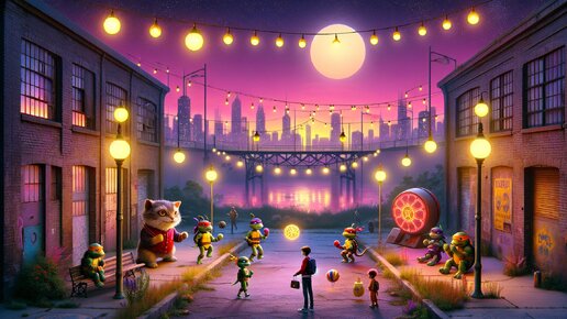 Вечером, когда небо над городом Реутов окрасилось в малиновые и золотистые тона заката, Никита решил пройтись по своей любимой тихой улице. Ему очень нравилось, как круглые фонари загораются в сумерках, придавая улице почти сказочный вид. Никита был обычным школьником, но у него была одна большая мечта - стать таким же сильным и отважным, как его любимые герои, черепашки Ниндзя. Каждый вечер он представлял себя в их роли, сражаясь с злыми силами и защищая мирных жителей. Проходя мимо старого складского здания, Никита неожиданно заметил яркий свет, который просачивался сквозь щели в воротах...