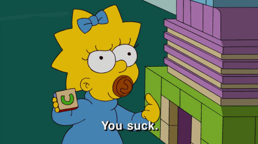 Вы замечали, что Мэгги часто играет в кубики, на которых написаны буквы? А присматривались ли вы к тому, что написано на этих кубиках? Я присмотрелась. И спешу поделиться с вами. Мэгги Симпсон – уникальный ребёнок. Несмотря на то, что она не говорит, она уже умеет стрелять, менять себе подгузники, художественно свистеть, играть на саксофоне и поразительно точно понимает всё, что происходит вокруг. А ещё она складывает слова из кубиков. И делает это часто. Стоит лишь присмотреться. Это может быть что-то очень простое, что поймут даже люди, плохо знающие английский язык...