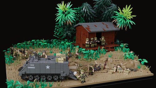 Горячие джунгли в LEGO-диораме от Nicholas Goodman! В этой потрясающей сцене — тропическое поле боя с детализированной бронетехникой, укрытиями и пальмами. Фигурки солдат расставлены так реалистично, что кажется, будто слышны выстрелы...