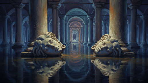 Одна голова лежит на боку. Вторая перевёрнута вверх ногами. Обе смотрят из-под колонн в полутьме, освещённые только прожекторами. Медуза Горгона — та самая, что превращала людей в камень взглядом — сама стала основанием для мраморных столбов в подземном водохранилище Стамбула. Почему головы перевернули? Версий две, и обе говорят больше о людях, чем о мифах. Цистерну Базилику построили не как храм и не как дворец. Это был стратегический резервуар для города, который слишком часто оказывался в осаде...