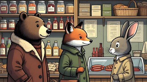 Сегодня предлагаем заглянуть в одну очень уютную лавку, где медведь, лиса и кролик заняты покупками.