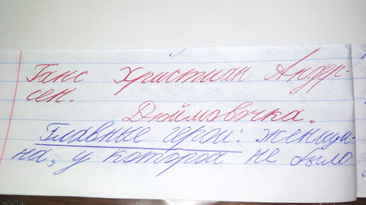 Герои: женщина, у которой не было детей; колдунья; девочка Дюймовочка; лягушка; сын лягушки; маленькие рыбки; бабочка; майский жук; другие жуки-друзья майского жука; полевая мышь; крот; ласточка; король эльфов; эльфы. У одной женщины не было детей и она обратилась к колдунье. Та дала ей ячменное зёрнышко. Женщина посадила его в горшок, откуда вырос цветок, в котором была девочка. Её назвали Дюймовочкой. Через некоторое время Дюймовочку выкрала лягушка и хотела выдать замуж за своего сына, но девочку спасли маленькие рыбки и бабочка...