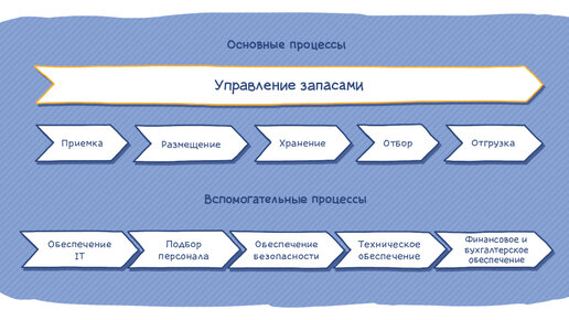 Логистический процесс на складе весьма сложен, поскольку требует полной согласованности функций снабжения запасами, переработки груза и физического распределения заказов. Структура решения задачи «Организация технологического процесса на складе» К основным бизнес-процессам на складе относят следующие: Основные и вспомогательные технологические процессы на складе Логистический процесс на складе гораздо шире технологического процесса и включает: Функционирование всех составляющих логистического процесса должно рассматриваться во взаимосвязи и взаимозависимости...