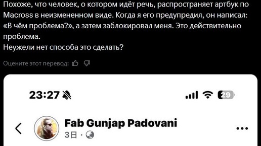 игр. Ему в соц.сети F... попалась на глаза ссылка на архив с сканами его артбука по Macross, которую выложил Fab Gunjap Padovani. Тензин написал ему в личку, что так делать не надо, а тот просто заблокировал его. Тензин поделился этой историей у себя в X и эта история получила большую огласку. Японские и не только фанаты начали кидать жалобы на Fab Gunjap Padovani и удивляться тому, что люди не уважают авторское право...