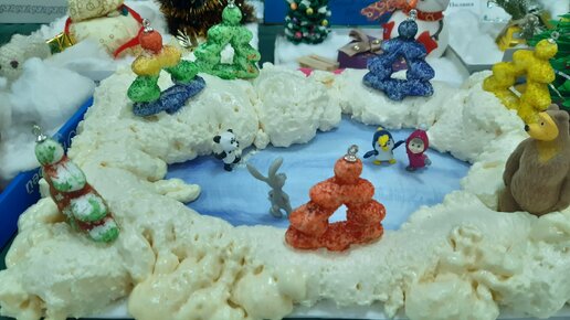 Сегодня я хочу рассказать об игрушке, созданной своими руками. К сожалению, нам ее не вернули после выставки в садике, хотя ребёнок очень просил. Это обычная поделка к новому году. Основа - монтажная пена, она изображает снег. Ёлки я купила в фикс прайсе, и мы раскрасили ее обычной гуашью, причём сын еще экспериментировал с цветами. Озеро- обычный лист бумаги, тоже покрашены и вырезанный неправильным овалом...