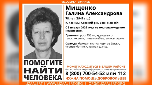 С начала января о судьбе пожилой женщины нет никаких сведений. К её поискам подключились добровольцы и профильные службы. В Брянской области разыскивают Галину Мищенко 1947 года рождения. Сообщается, что женщина проживала в посёлке Косицы Севского района, однако с 3 января 2026 года связь с ней была утрачена, и её местонахождение до сих пор неизвестно. Поисковики уточняют, что пропавшая может находиться как на территории Брянска, так и за пределами своего района...