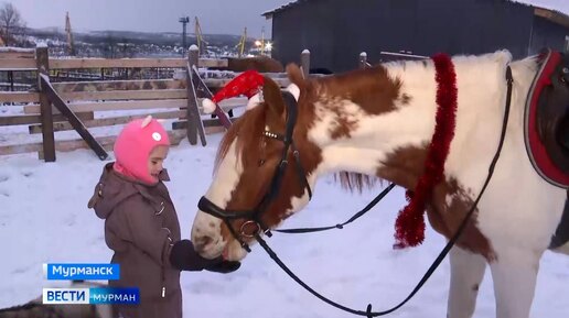Чтобы год лошади сложился удачно, маленькая Есения отправилась в мурманскую конюшню приручать пятнистого коня Мальборо