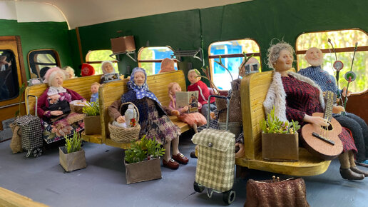 Для сюжета с грибниками я решила сделать кусочек вагона электрички, рассадить там довольных героев и снять возвращение домой. Мне хотелось сделать старую модель , с деревянными скамейками, зелеными станами. В детстве такие скамейки мне казались ужасно неудобными и жесткими. Но очень захотелось создать вот такой старый вагончик! Для этого я склеила кусочек вагона из разных видов картона, для пола использовала пеноплекс. Чтобы обрамить полукруглые окошки, я подобрала гнущийся переплетный картон. Вместо стекол вставила кусочки прозрачного пластика...