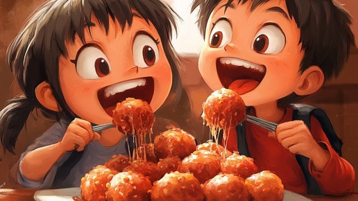 Создано на основе запроса: two cartoon character eating meatball , they are happy , middle plate full of meatballs ghibli style