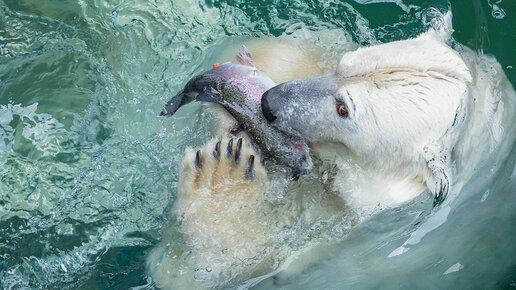 Молодая белая медведица Урсула, живущая в парке "Роев ручей" очень любит плавать в бассейне, а еще очень любит ловить живую рыбу, которую ей в теплое время года каждый день запускают в бассейн. Эта рыбалка традиционно собирает целые толпы посетителей...